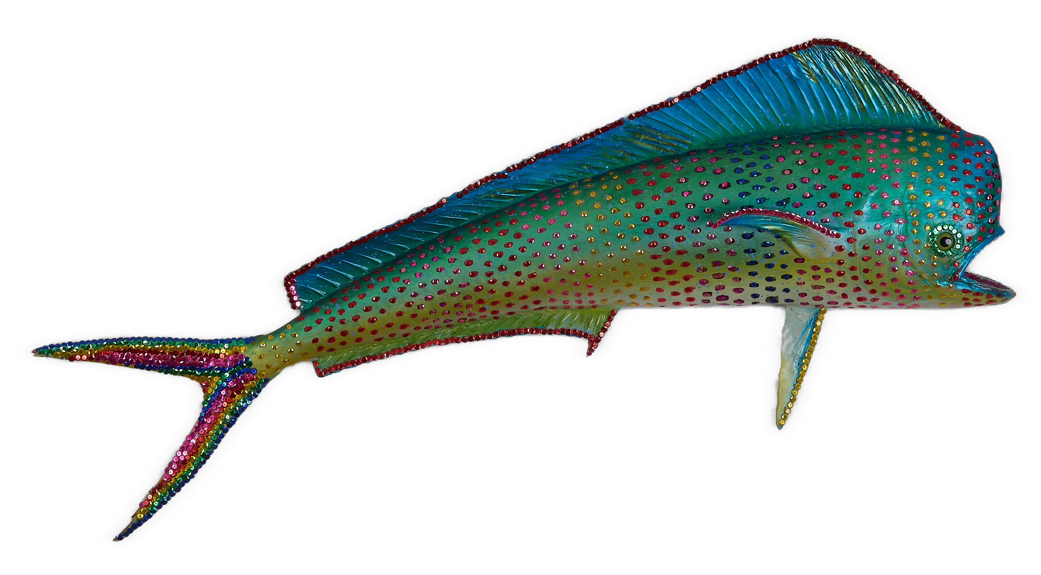 nail polish, glue, and sequins on bull dolphin half mount